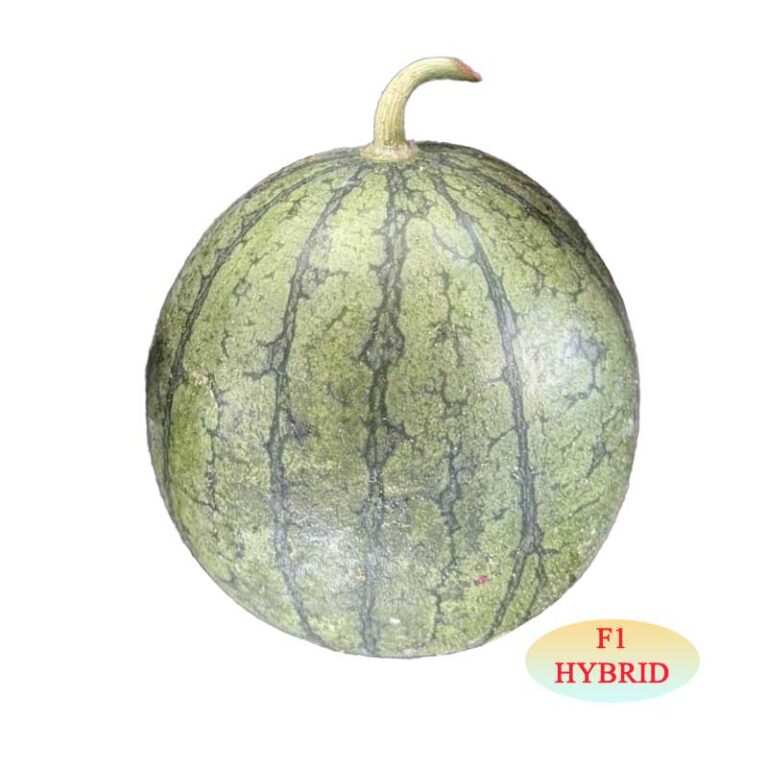 Round fruits with green skin and dark green stripes, bright red crisp-sweet flesh, medium-thin rind, vigorous vines, good fruit set, and tolerance to anthracnose.